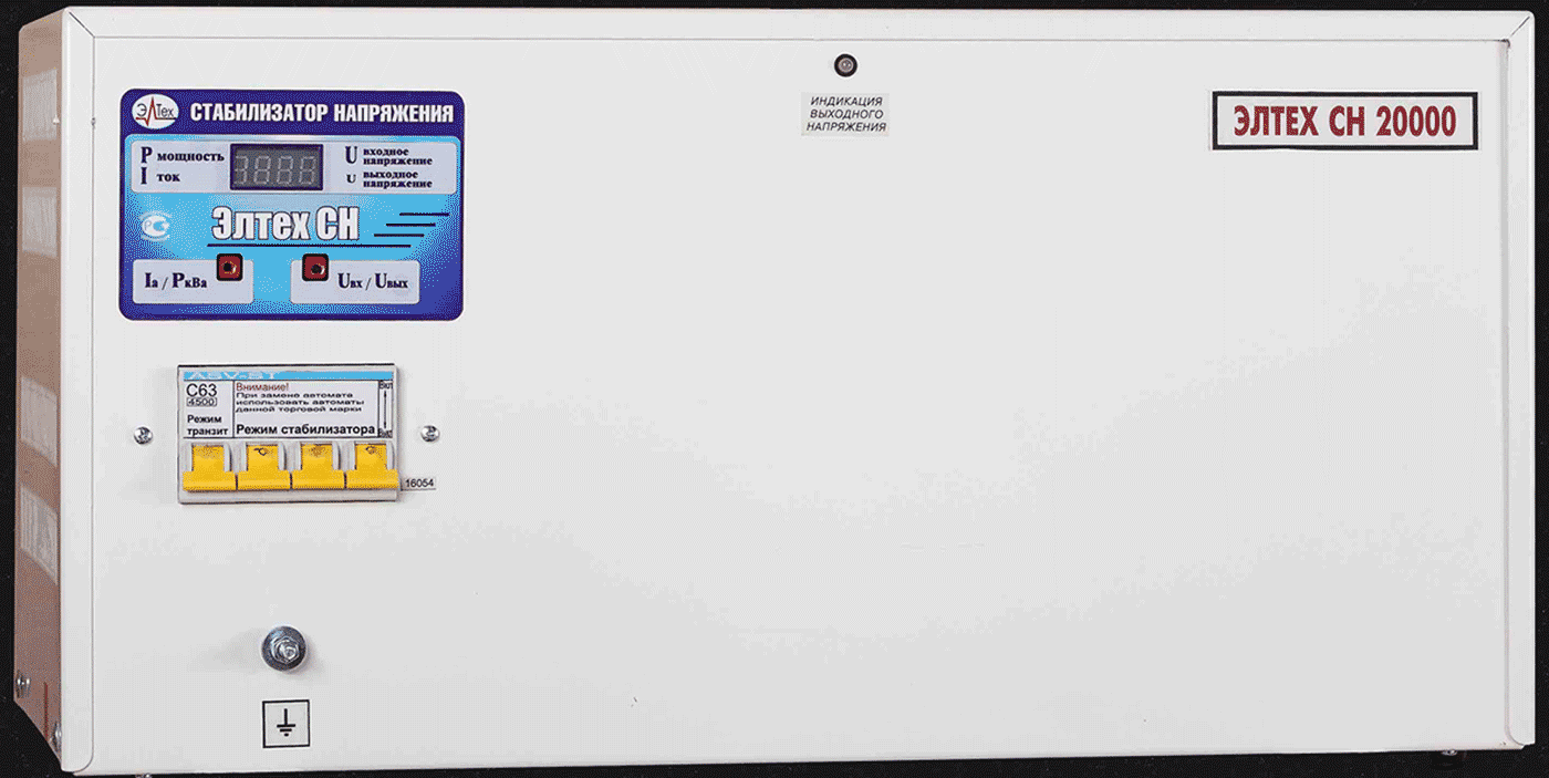 В стабилизаторе имеется трехкратный запас мощности. Такой механизм позволяет подключать электроинструмент с электродвигателем прямого пуска. ЭЛТЕХ СН20000 используют для стабилизации подачи электроэнергии в квартиру, загородный домик или небольшой офисный центр. Прибор полностью автоматизирован и рассчитан на круглосуточный режим функционирования.