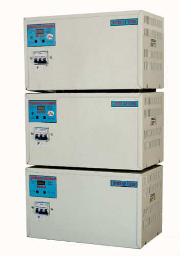 Устройство представляет собой комплект из 3-х однофазных стабилизаторов, который при необходимости дополнительно укомплектовывается стойкой и блоком контроля фаз. Назначение указанного блока: контроль над порядком чередования фаз, над пропаданием одной из фаз, а также над возможным перекосом фаз.